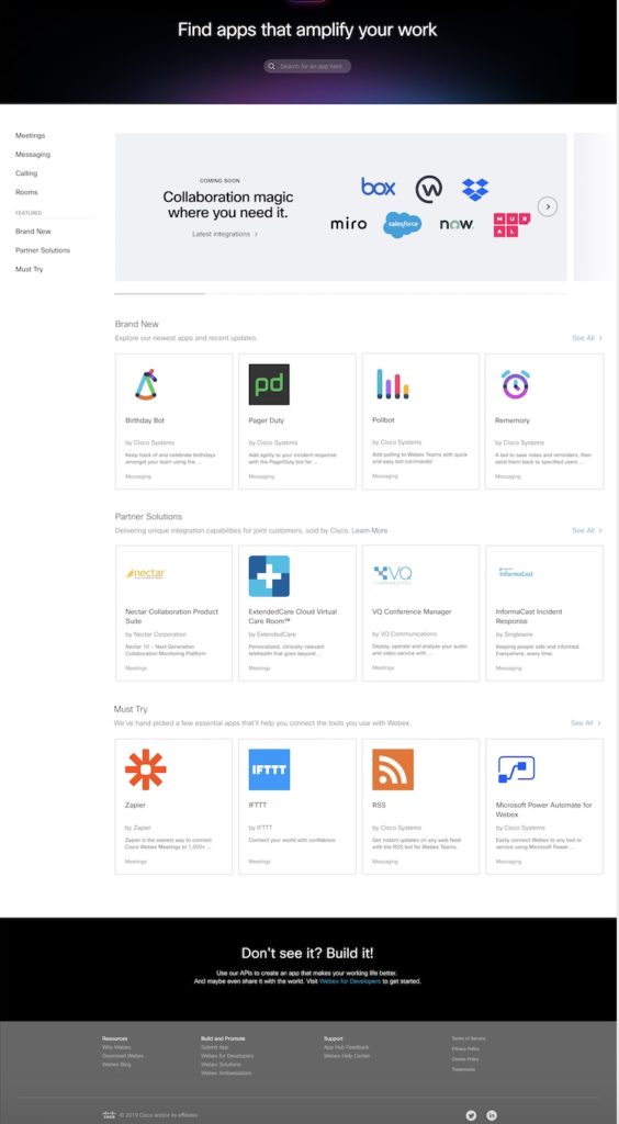 - El nuevo Webex App Hub es un ecosistema de aplicaciones de colaboración de primer nivel, que incluye integraciones prediseñadas.