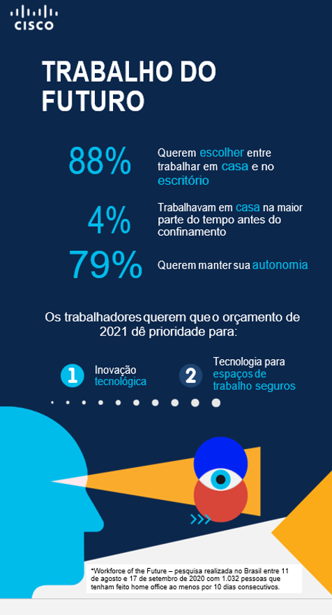 - Novo estudo da Cisco revela que 88% dos trabalhadores brasileiros gostariam de poder escolher entre trabalhar em casa ou no escritório, além de poder gerenciar seus horários.