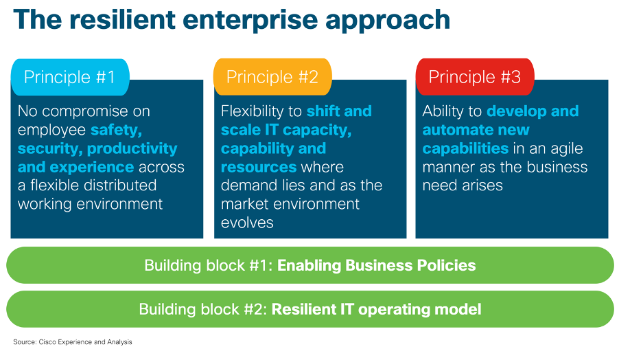 Finally, the last principle of the resilient enterprise approach, rests on the idea that the needs of the business keep changing and if the organization intends to keep up, it needs to adapt quickly, developing and deploying capabilities almost instantaneously. With the pandemic forcing organizations to accelerate deployments at scale, across the enterprise, leaders realize that they really need to invest in automation, virtualization, orchestration, and management if they want to really go digital in the true sense of the word.