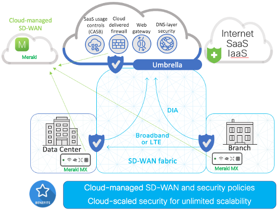 A popular Cisco SASE architecture would combine Cisco Meraki cloud managed networking, Umbrella and Duo.