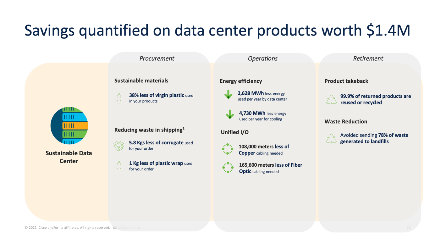 Cisco has committed to eliminating the use of virgin plastics, wet-based painting, foam- and paper-based packaging, and so on – all of which help customers see an immediate reduction in the carbon footprint of the products they’re investing in. The result is a ‘data center’ that is built sustainably.