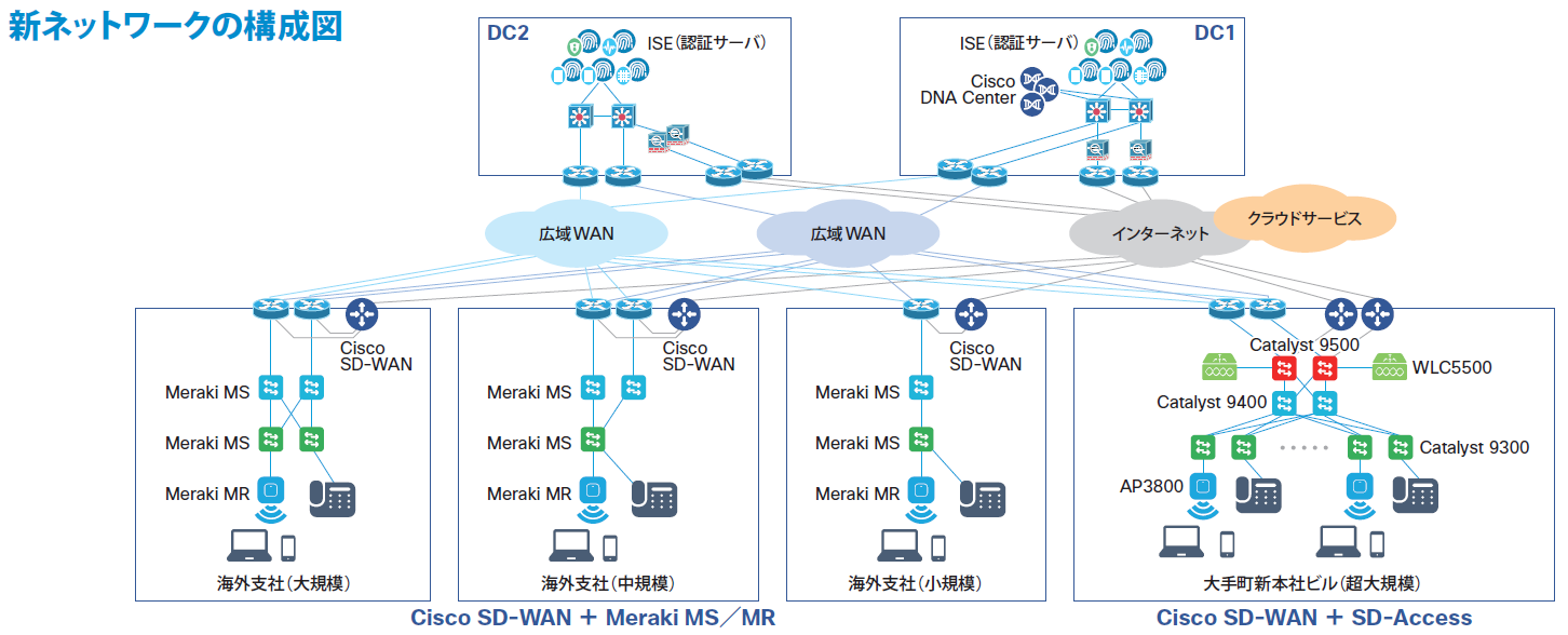これまで国内外拠点からのインターネット接続は、全てデータセンターを経由する必要があり、アクセス遅延の原因となっていました。そこで新本社ビルと海外拠点ではCisco SD-WANを導入しました。クラウド型のWebプロキシサービスを併用し、要件に合わせて各拠点からインターネットへアクセスすることで、通信遅延の解消に繋がりました。