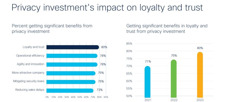 この 5 年でプライバシー関連の支出は 2 倍以上となり、メリットは拡大傾向にあり、引き続き強力なリターンが得られています。今回の調査では、95% がプライバシー上のメリットがコストを上回るとし、平均的な組織の投資額に対するプライバシーのメリットは平均で 1.6 倍となっています。さらに、80%がプライバシー投資から得られる大きなメリットとして「ロイヤルティや信頼」を挙げ、最もプライバシー成熟度の高い組織では92%と、さらに高くなっています。