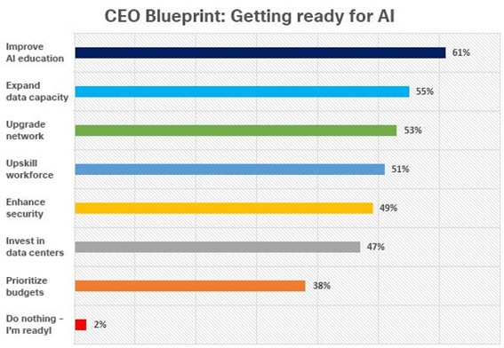 シスコの調査によると、CEOたちは懸念材料を前向きに捉えるための計画を立てていることが明らかになりました。それは、知識やスキルに投資し、インフラストラクチャをアップグレードし、AI需要に備えたセキュリティを強化です。(図 2)。