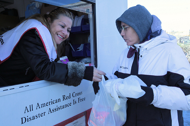 Fatima Velasquez, a volunteer for the American Red Cross, provides snacks to Jennifer Rivera from a Red Cross mobile feeding unit in the Rockaways, New York, on January 2, 2013. Photo: American Red Cross/Virginia Hart