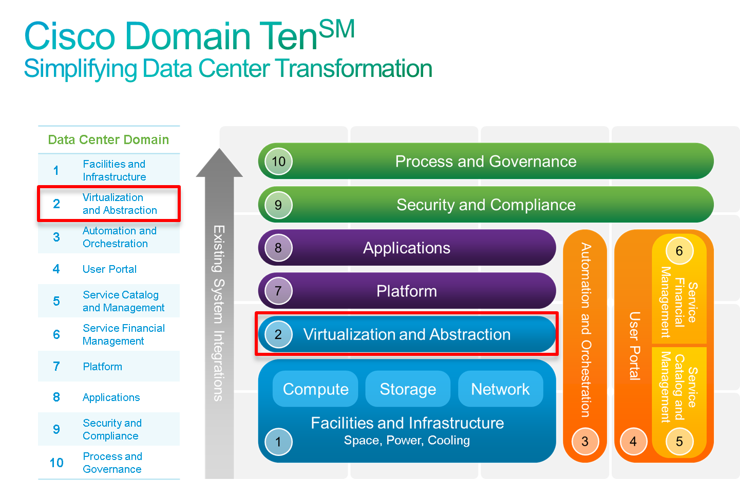 Last week I introduced our new Cisco Services framework to help guide your data center and cloud transformation – Cisco Domain Ten (SM). I also described the types of challenges you should be thinking about in the Facilities and Infrastructure layer, Domain 1. Now let’s discuss the type of challenges that Domain 2, Virtualization and Abstraction, could present to you. While Cisco Domain Ten can be applied to help you in any data center transformation, I’ll keep focused on showing you how Cisco Domain Ten helps illuminate your path to cloud transformation.