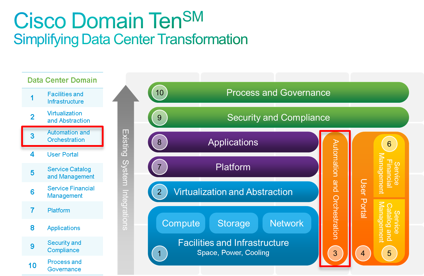 Continuing my tour of the Cisco Domain Ten (SM) framework for simplifying data center transformation, with this blog, I’ll build upon my previous blogs and introduce Domain 3, which is concerned with “Automation and Orchestration“.