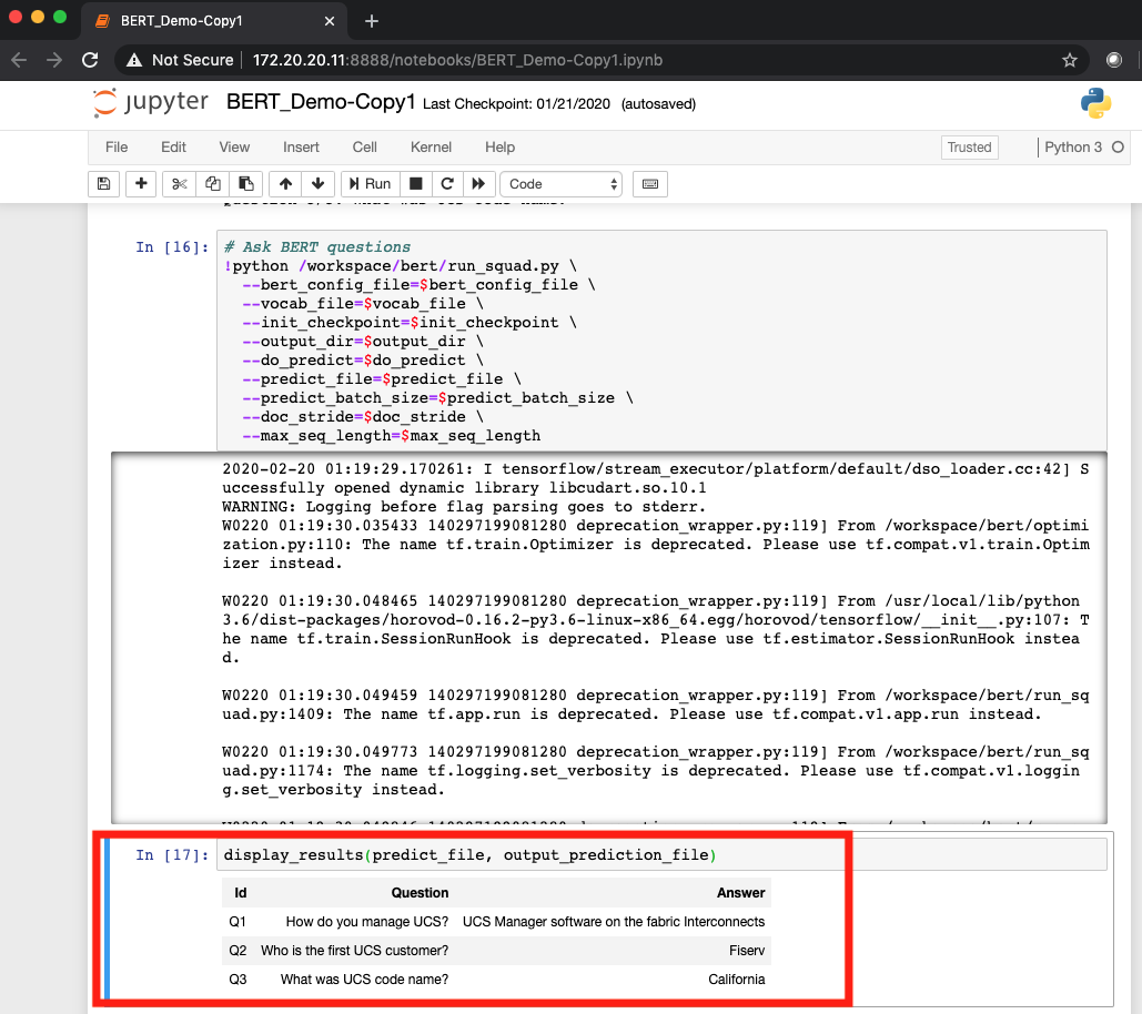 One of the most exciting developments in AI/ML has been in Natural Language Processing (NLP). Google has created the pre-trained Bidirectional Encoder Representations from Transformers (BERT) model, which can process natural language much better than many previous models. At Cisco Live, we showed BERT running on a Cisco UCS C480 ML with 8 x NVIDIA V100 GPUs in a Jupyter Notebook that a typical data science team would use. Then, we fed the text from the Wikipedia page on Cisco UCS and asked BERT to find the answers. As you can see in the screenshot below, BERT was able to accurately answer multiple questions.