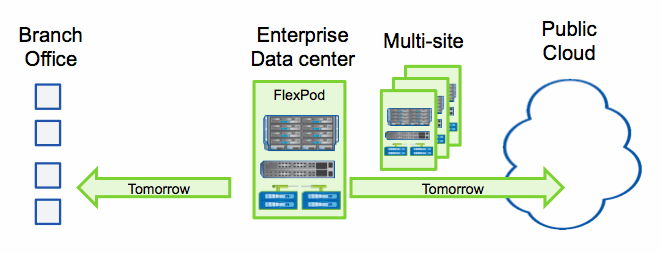 So what comes next? FlexPod solutions to date have been aimed squarely at the enterprise data center. What Cisco and NetApp announced today expands the architecture on two key axis. Both vectors support the growing challenge IT organizations face today: spanning from the data center core out to the branch office and also into the cloud (both to deliver services and to procure them.) Location independence for applications across this continuum requires infrastructure that can be tuned to support a wide spectrum of workloads and operating models. To do it efficiently requires uniformity in deployment and operating models.