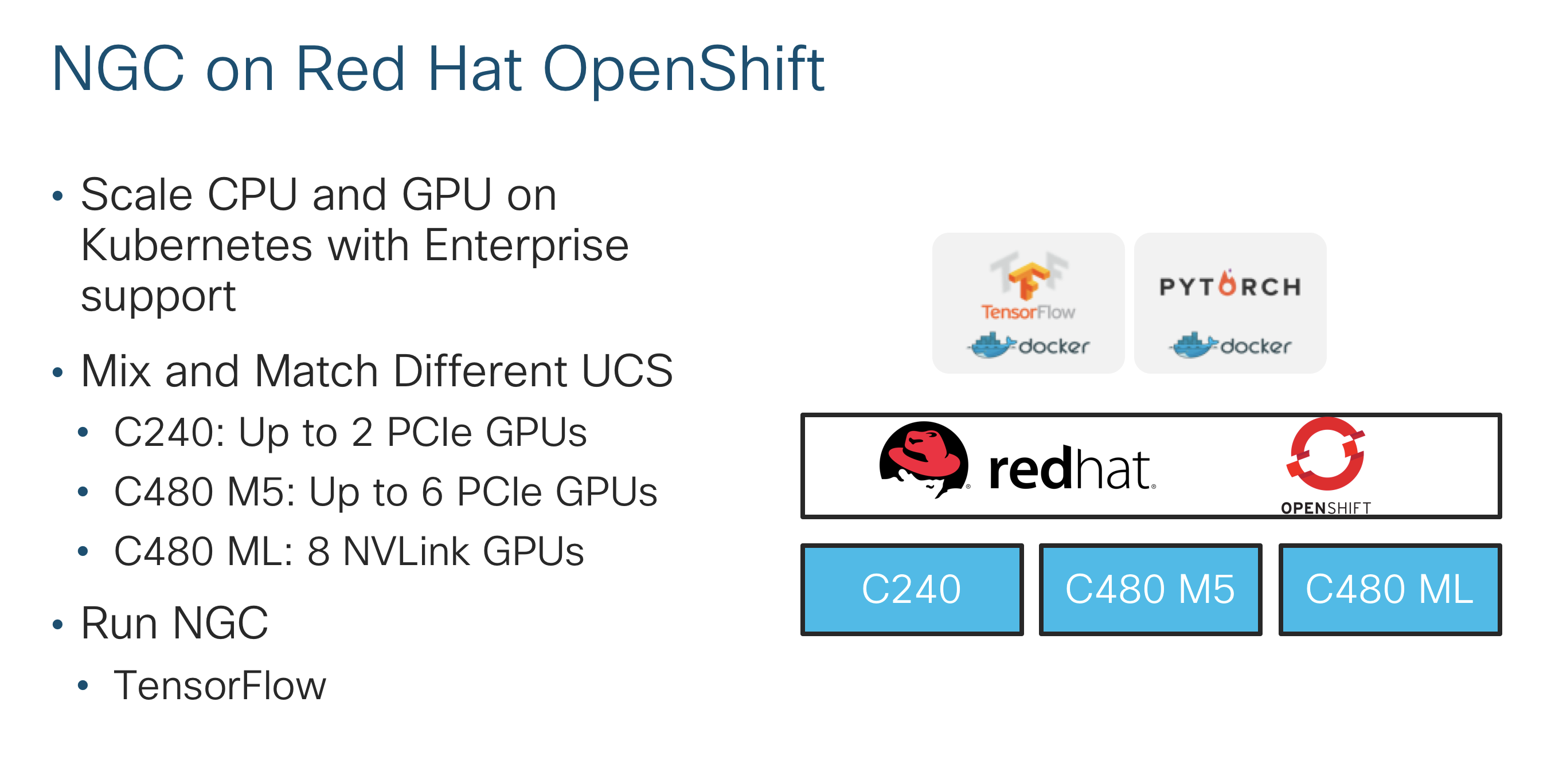 While some customers prefer Hadoop as the clustering tool, others are choosing Red Hat OpenShift as the Kubernetes container orchestrator with enterprise support. In Barcelona, we will also show NGC running on OpenShift enabling support for multiple data scientists with both interactive and batch workloads.