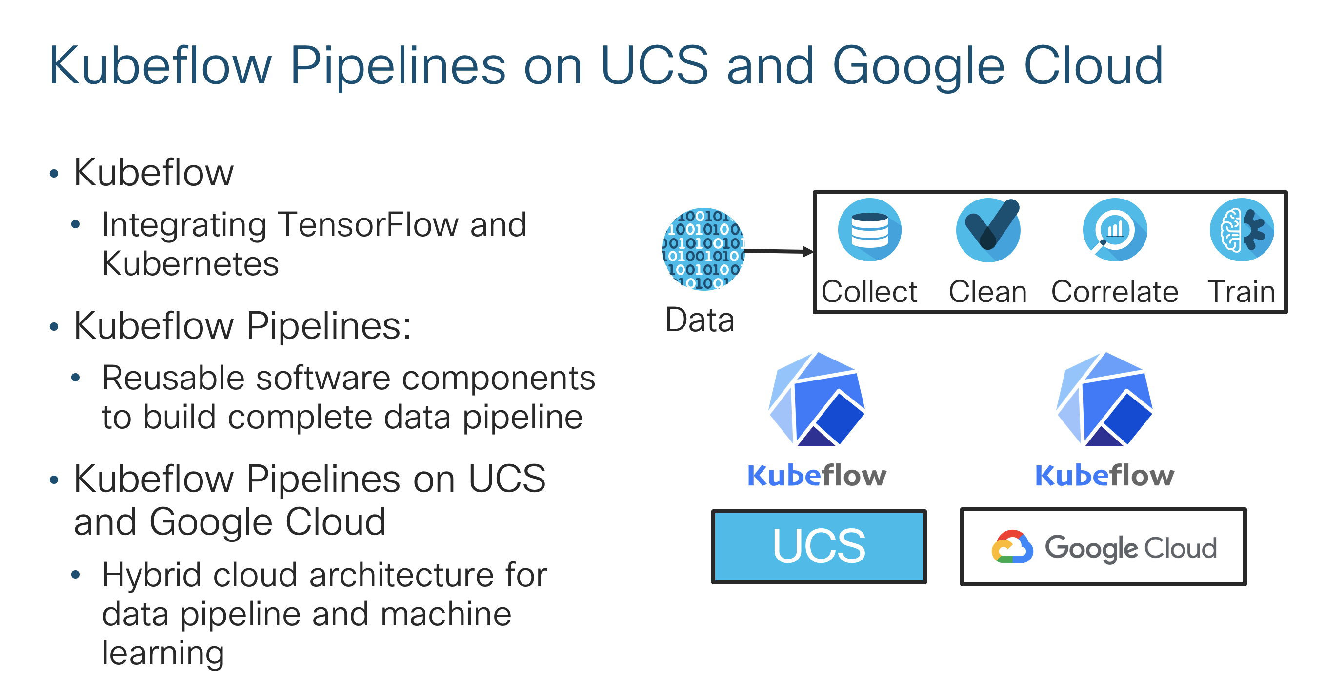 While many customers have the bulk of their data on-premise, some data scientists would like to do machine learning experiments in the cloud. In November, 2018, Google announced Kubeflow Pipelines. At Cisco Live Barcelona, in partnership with Google, Cisco will demonstrate Kubeflow Pipelines running on both Google Cloud and UCS enabling a true hybrid cloud experience.