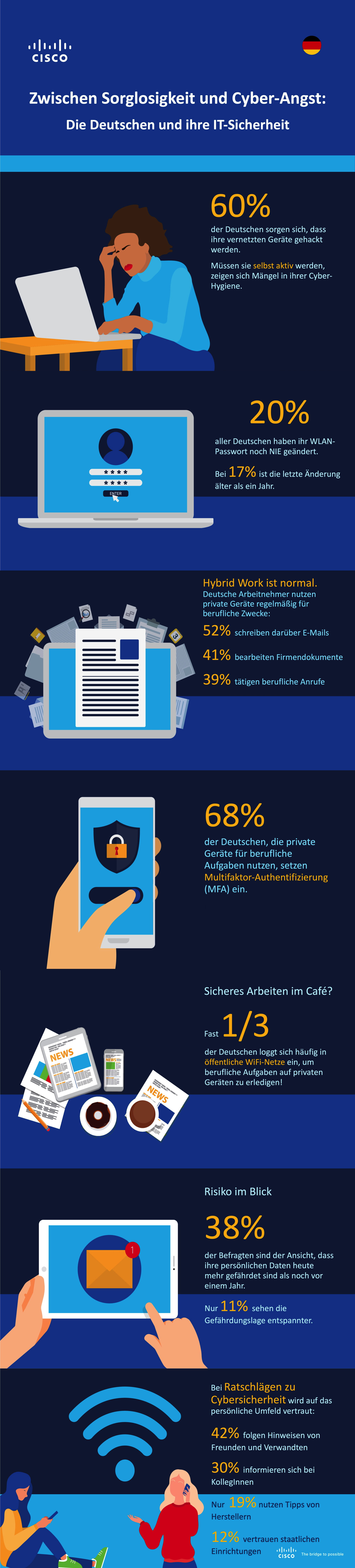 Die „EMEA Consumer Security“-Studie wurde im August 2022 durch Censuswide im Auftrag von Cisco in Deutschland und anderen Ländern erhoben – darunter u.a. dem Vereinigten Königreich, Frankreich und Italien. An der Befragung nahmen in Deutschland 1.000 Personen teil, 50 Prozent davon Vollzeitbeschäftigte.