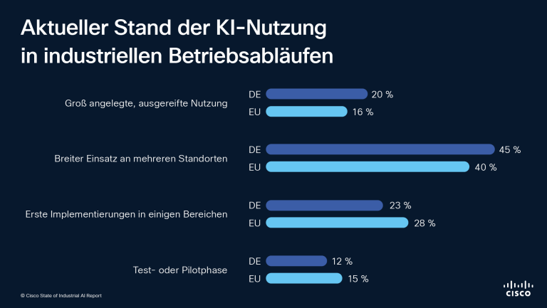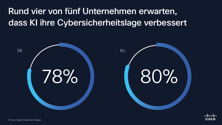 Der „Cisco State of Industrial AI Report“ basiert auf Daten einer weltweiten Umfrage unter mehr als 1.000 Entscheidungsträgern im Bereich Betriebstechnologie, die von Cisco in Zusammenarbeit mit Sapio Research durchgeführt wurde. Die Umfrageteilnehmer stammen aus 19 Ländern und 21 Branchen, davon kommen 500 aus Europa und 100 aus Deutschland. Sie repräsentieren eine Vielzahl von Branchen, darunter Fertigung, Transport/Logistik, Energie/Versorgung und weitere. Die Studie fasst die Ergebnisse von Entscheidungsträgern in Unternehmen mit einem Jahresumsatz von mehr als 100 Millionen US-Dollar zusammen.