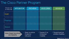 El nuevo Cisco Partner Program se basa en cuatro roles clave que los partners desempeñan: Integrador, Proveedor, Desarrollador y Consultor. Los partners pueden elegir centrarse en solo un rol o en los cuatro, lo que tenga más sentido para su negocio. La marca Gold de Cisco sigue siendo la piedra angular del nuevo programa, a la vez que se optimizan los niveles Premier y Select, garantizando así que los partners tengan la libertad necesaria para diferenciarse ante sus clientes. A los actuales partners de Cisco no se les pedirá que vuelvan a empezar con este nuevo programa, ya que se ha diseñado para reflejar y reconocer su larga dedicación y contrastada experiencia con Cisco.