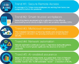 Madrid, 19 de enero de 2021. – Durante la pandemia y ante situaciones adversas como ‘Filomena’, las Redes han garantizado la continuidad de las operaciones de empresas y Administraciones. Ahora, su misión consiste en facilitar la evolución, la innovación y el crecimiento, generando nuevos modelos de negocio y servicios. Según el informe Cisco Global Networking Trends, las cinco tendencias clave en networking para 2021 son: