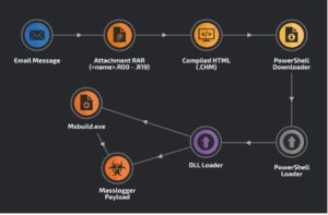 Masslogger extrae los datos a través de los protocolos SMTP, FTP o HTTP. La nueva campaña destaca por utilizar un archivo HTML compilado para iniciar la cadena de infección. Este formato se utiliza normalmente para los archivos de ayuda de Windows, pero también puede contener componentes de script activos -en este caso JavaScript- que lanza los procesos del malware.