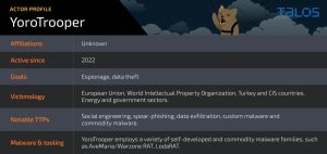 Milano, 15 marzo 2023 – Cisco Talos, la più grande organizzazione privata di intelligence al mondo dedicata alla cybersecurity, ha identificato una serie di campagne di spionaggio attive da giugno 2022 denominate YoroTrooper.