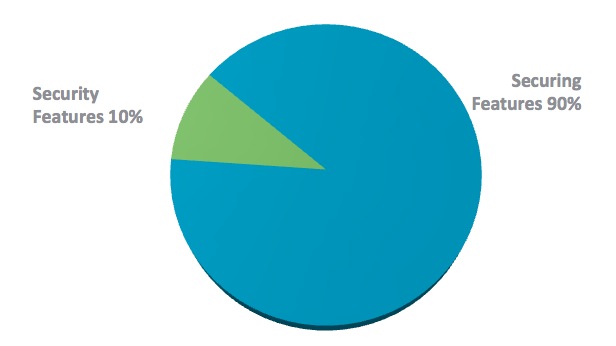 His point is that there is much more work to do in securing all the features of a product than simply writing the security features. Writing security features, although important, is only 10% of the workload of creating secure code. The other 90% of the coding work is meant to ensure that all non-security codebase is secure. This includes input validation, output encoding, and overflow defense.