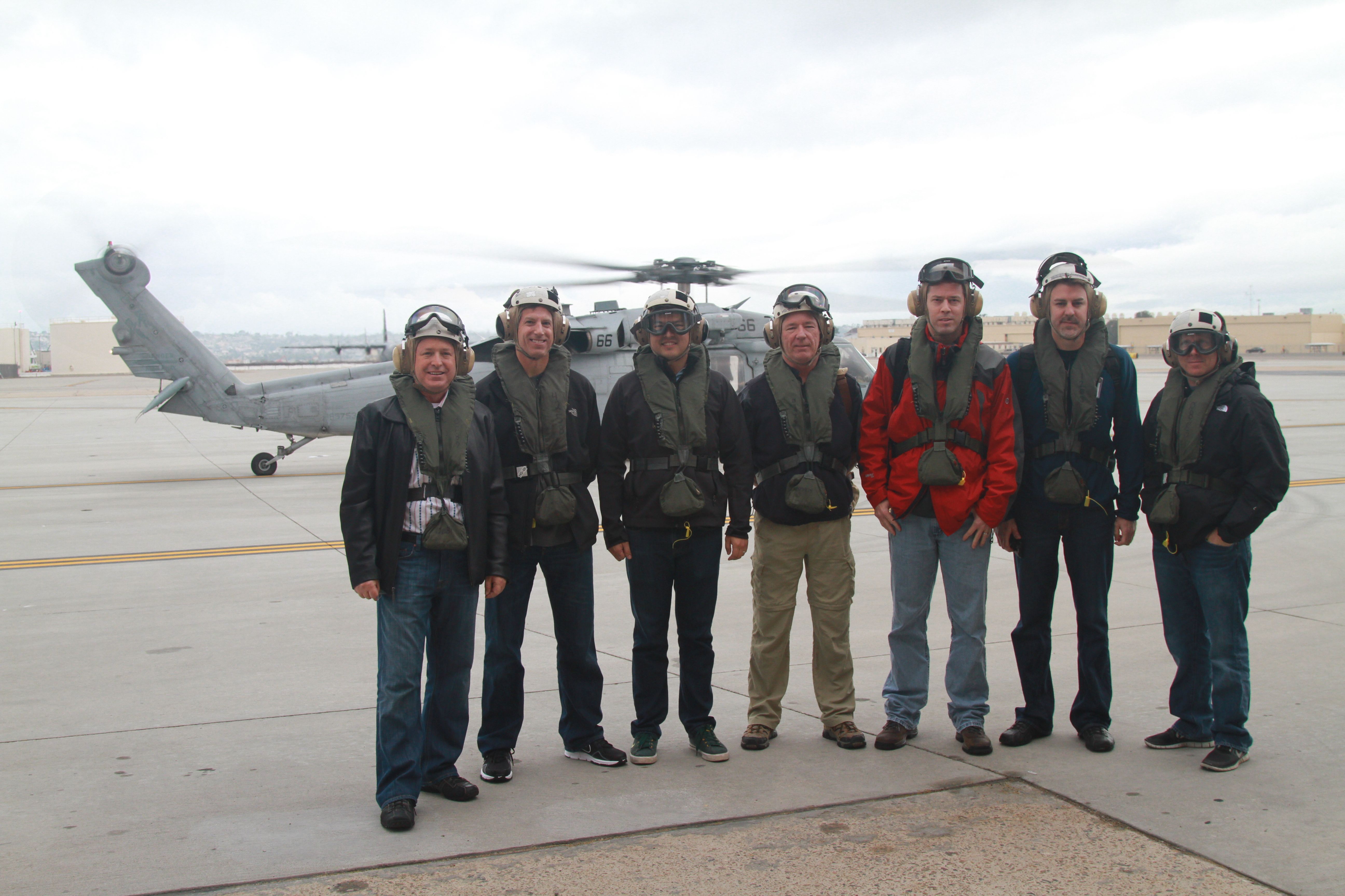 The day began at 06:00 hours meeting our contact, Senior Chief Petty Officer Robert Winkler at the truck gate entrance to Naval Amphibious Base Coronado (the West coast home of the Navy SEALs). After the seven people in my group arrived, we had a short briefing at the headquarters building for the commander of the Naval Surface Warfare Fleet. We were then transported across the island to Naval Air Station North Island to await our transport out to the Spruance, which was already underway a good distance off the coast of San Diego. I was excited to learn that we would be flying to the ship aboard a SH-60 Seahawk helicopter and landing on the aft helipad while the ship was underway. This was certainly a first for me. Our “helo” arrived and we had a briefing with the crew on our flight, the survival collars and gear we would be wearing, what to do in the event we had to ditch at sea, etc. My first laugh of the day came when I saw the expression on the faces of two others in the group that should we have to ditch, “wait for the helo to flip upside down, then hit the quick release, and climb/swim out…”. They looked terrified, but the crew did a great job putting them at ease. We finished our briefing with instructions on how to enter/exit the helo and then were told to put our helmets and goggles on and follow the crew outside.