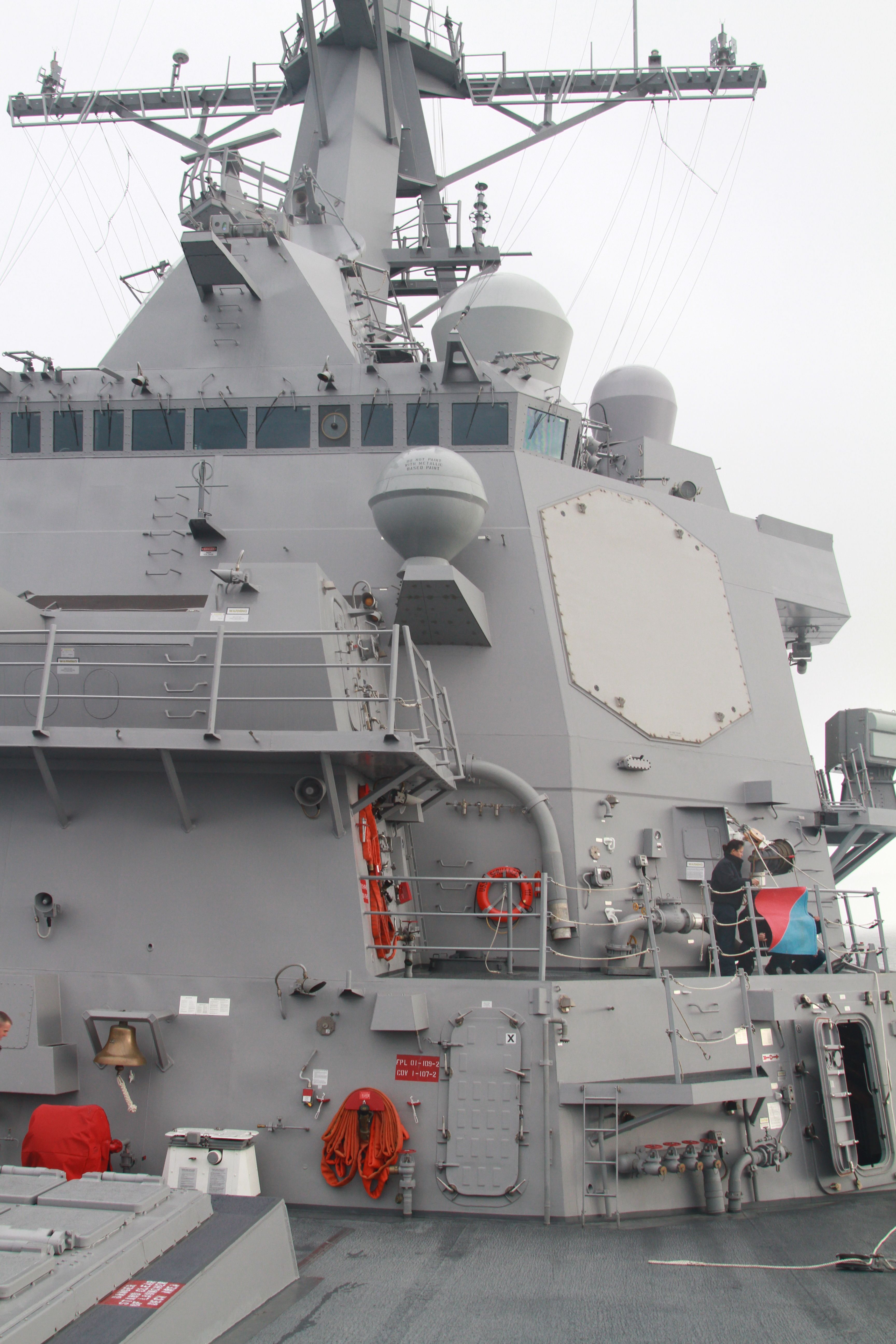 We then exited the helo and were lead inside one of the two helo hangars on the Spruance where we were greeted by the ship’s captain, Commander George Kessler, and Ensign Joe Horn, the public affairs officer for the Commander Kessler (Ensign Horn’s main duty was as a weapons officer). We met with Commander Kessler, his XO and Ensign Horn in the officer’s ward room for a brief history of the ship, some specifics on Arleigh Burke Class destroyers, background on Admiral Spruance and why his name-sake was used for this ship. After that we began a tour of the entire ship, from standing on the bow next to the 5-inch gun and forward missile deck to walking to the aft section missile deck, viewing the Sea Whiz cannon and the devices that allowed them to resupply at sea. Then we went back inside the pressurized interior of the ship, down through the tiny ladder spaces to the engine room, mess hall, helo hangars, and generally every area of the ship except for the crew’s living quarters. We avoided that area as there are always crew sleeping depending on watch/shift schedules and they don’t want the crew to “feel like animals in a zoo”.