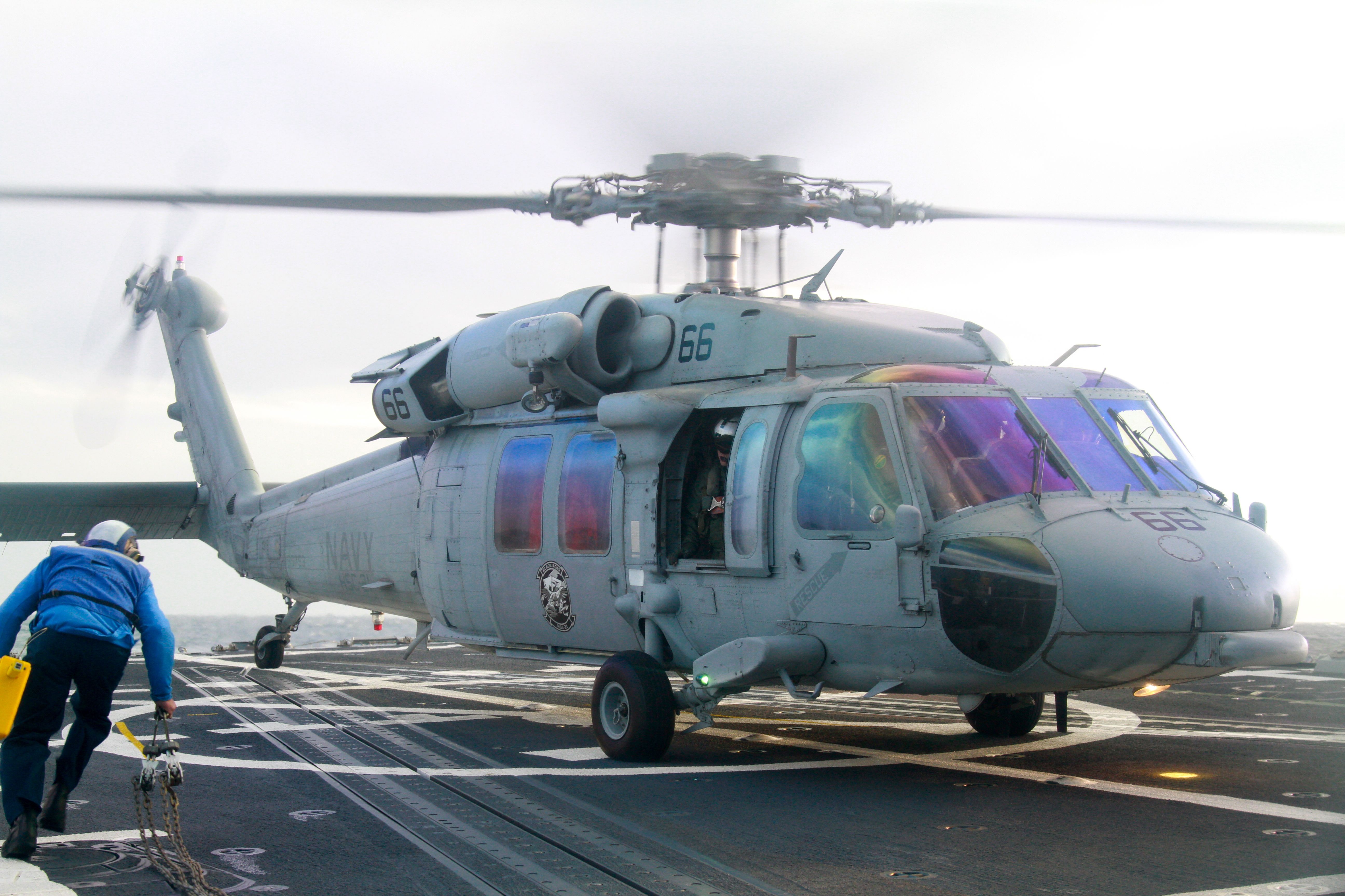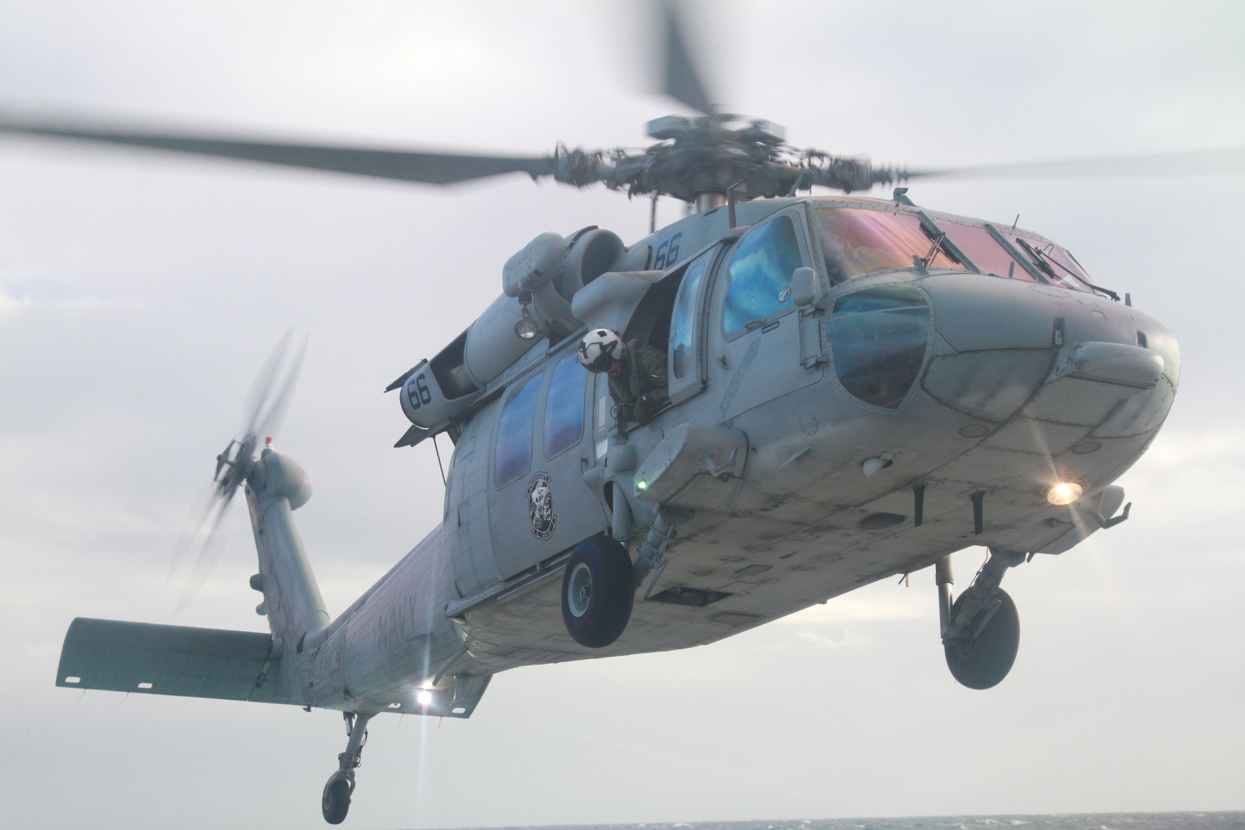 Once everyone was strapped in and after a short taxi to the designated helipads, we lifted off and began our trip out to the ship. We were told the weather wasn’t ideal out at the ship and we might not be able to land (as they don’t take chances with civilians on board if they don’t have to). The weather was overcast and raining, but it was a light rain and our 45-minute flight was surprisingly smooth. Not having radios in our headsets, there was no communication from the crew so we didn’t really know when we’d reach the ship. However, I felt us begin to descend and after a few short moments, I saw the wake of a ship down in the water and could tell we were on way down to the Spruance. After a few seconds, I saw the aft section of the ship and very noticeable sight of a helipad as it continued to cruise. We hovered very briefly and touched down amazingly smoothly and much quicker than I anticipated given the slightly rough seas. This crew (part of the “Blackjacks” squadron) made landing on a moving target with VERY little margin for error seem like a simple, routine event.
