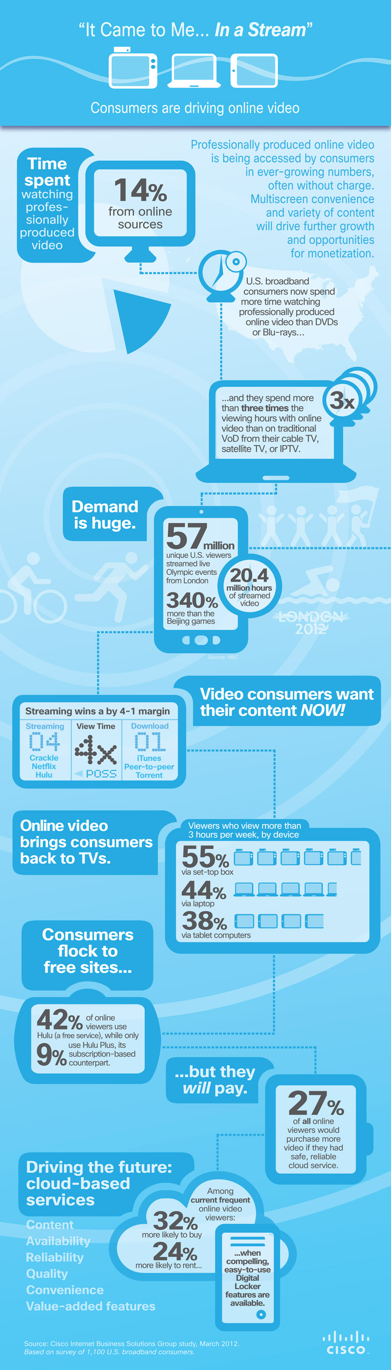 Today, a smorgasbord of options continues to multiply—from premium cable and DVDs, to online choices such as Apple, Netflix, and Hulu. Hardware options are equally dizzying, as traditional TV gives way to PCs, smartphones, and tablets. As portable devices meet the cloud, more consumers expect to view their favorite content anywhere, anytime.